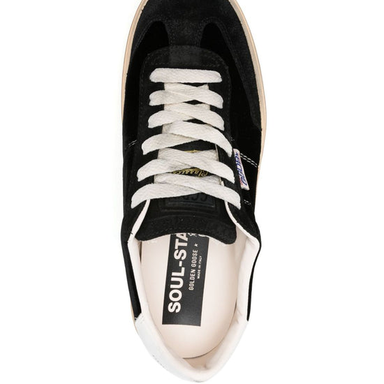 Black velvet distressed effect round toe suede panelling logo-print tongue mini logo tag embroidered logo to the side contrasting branded heel counter branded leather insole leather lining flat rubber sole front lace-up fastening soul-star suede leather sneakers size and fit - heel: 3.0 centimetres. sole height: 2.0 centimetres.