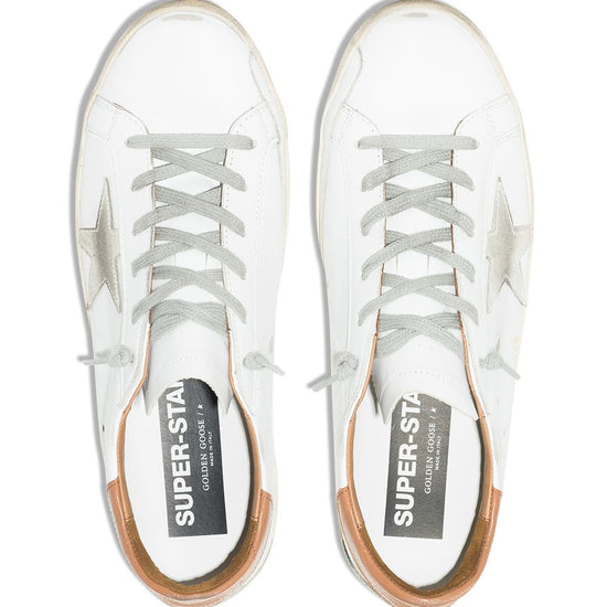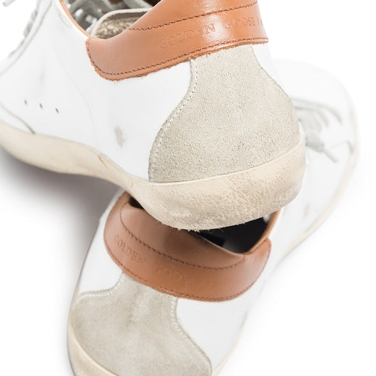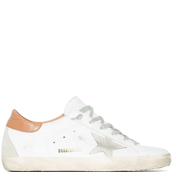 White/ice/light brown leather/fabric signature star patch to the sides distressed effect front lace-up fastening round toe logo patch at the tongue branded insole contrasting heel counter flat rubber sole super-star leather sneakers