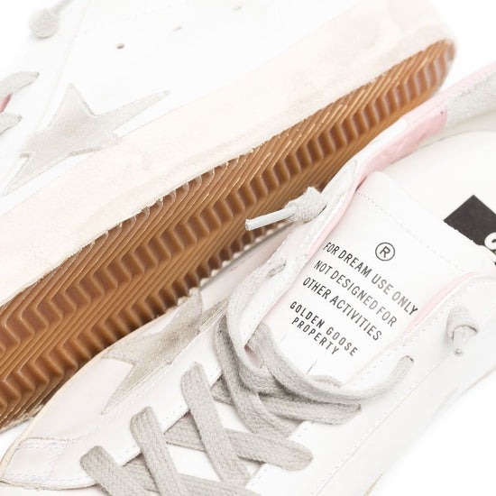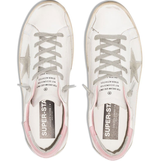White/rose pink leather distressed effect signature star patch to the sides front lace-up fastening round toe flat rubber sole super-star leather sneakers