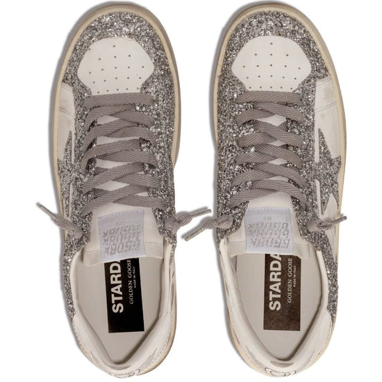 White leather logo patch at the tongue front lace-up fastening glitter detailing star patch detail round toe flat rubber sole stardan leather sneakers