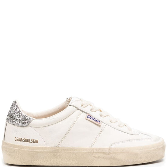 White leather glitter detailing logo tag gold-tone logo lettering round toe front lace-up fastening contrasting branded heel counter branded insole flat rubber sole soul-star leather sneakers size and fit - heel 0,8 in / 2 cm