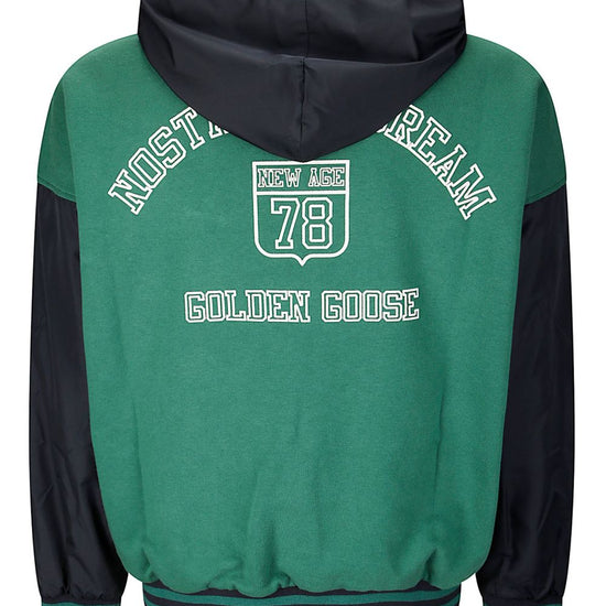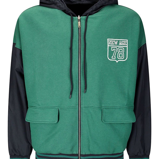 Forest green front zip fastening two side flap pockets stripe trim slouchy drawstring hood +zip, colorblock organic cotton reversbile hoodie size and fit - this piece fits true to size. we recommend you get your regular size. model is 1,84m / 6ft 1in wearing size m