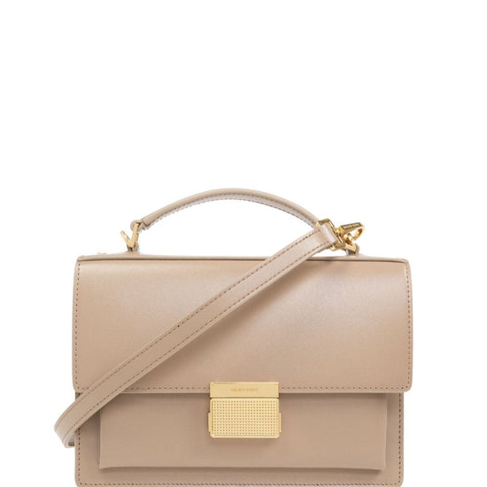 Beige calf leather square body single flat top handle adjustable detachable shoulder strap main compartment embossed internal logo internal slip pocket full lining gold-tone hardware front clasp fastening gold-tone logo lettering this piece comes complete with a protective dust bag. venezia leather handbag size and fit - width 8,46 in / 21,5 cm height 5,91 in / 15 cm depth 3,15 in / 8 cm.