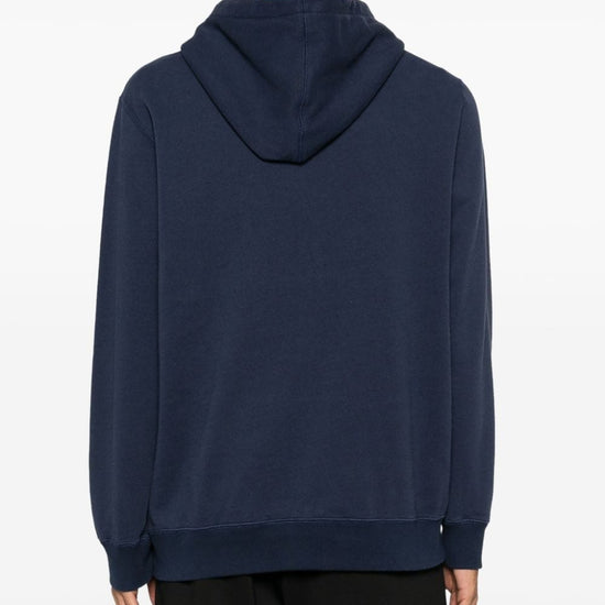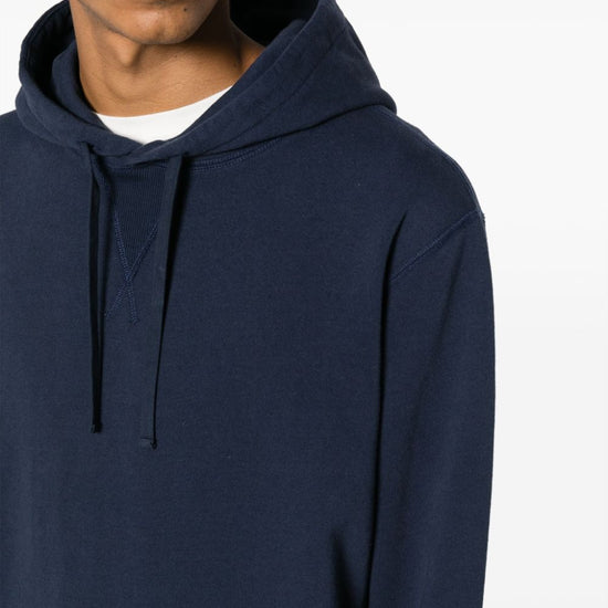 Classic cotton hoodie from gramicci featuring jersey texture, drawstring hood, drop shoulder, front pouch pocket, ribbed cuffs and hem, french terry lining, navy blue, cotton and long sleeves. cotton hoodie size and fit - this piece fits true to size. we recommend you get your regular size. model is 1,84m / 6ft 1in wearing size m