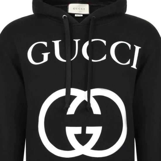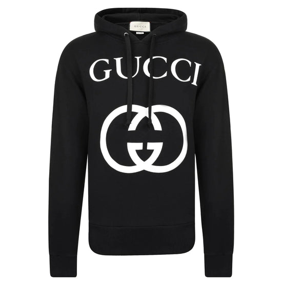 stay cosy and stylish with the gucci logo hoodie sweatshirt in black. this classic hoodie features a bold gucci logo on the chest, made from premium materials for comfortable and durable wear. upgrade your casual wardrobe with this must-have item from gucci.