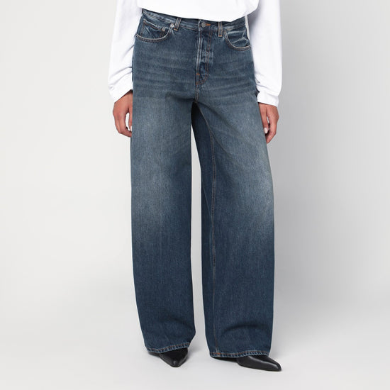 Wide jeans by haikure in dark blue cotton denim with a faded effect, characterized by a high waist with belt loops, front closure with zip and button, five classic pockets, and a back logo patch. size and fit - model wears size 26 model measurements: height: 178 cm chest: 83 cm waist: 63 cm hips: 91 cm