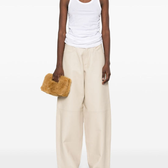 Light beige concealed fly and button fastening belt loops classic five pockets wide leg bethany leather trousers