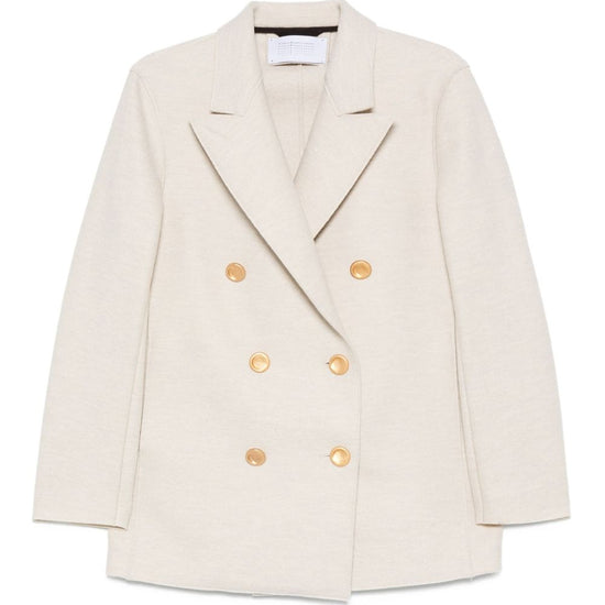 Beige double-breasted fastening gold buttons notched lapels long sleeves straight hem wool double-breasted coat