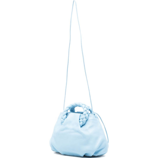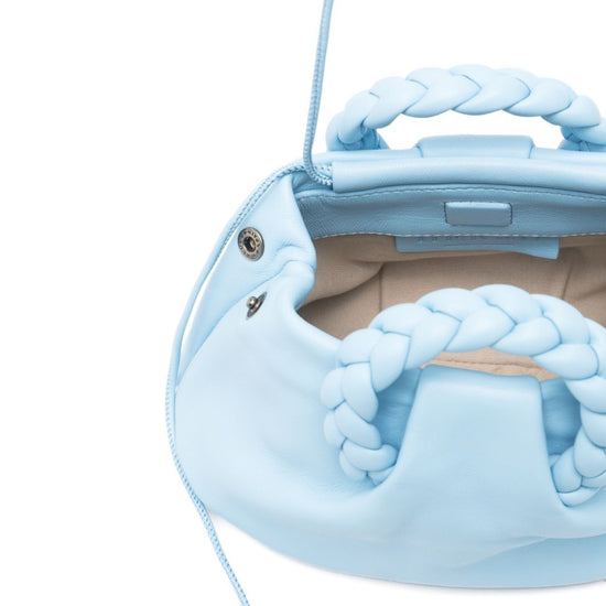 Blue braided top handles shoulder strap gathered detailing this piece comes complete with a protective dust bag. bombon leather handbag