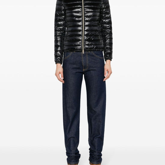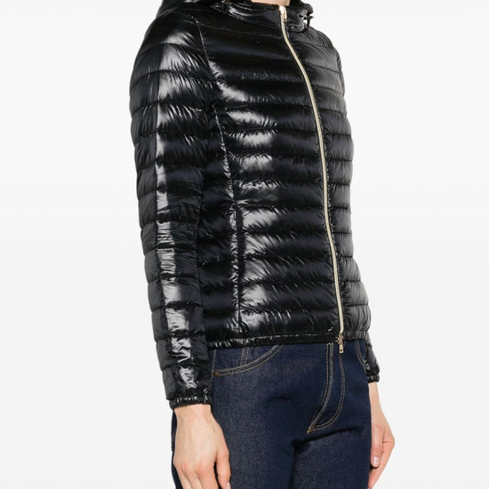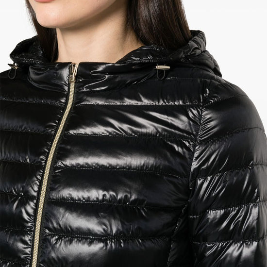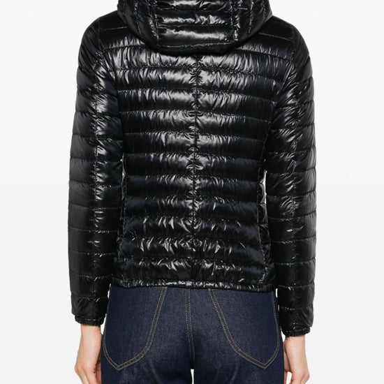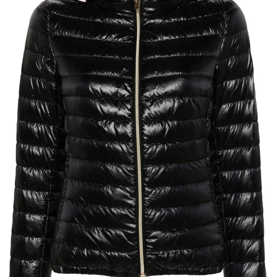 Black feather down padded design quilted gold-tone logo plaque logo-engraved gold-tone hardware detachable drawstring hood front two-way zip fastening long sleeves elasticated cuffs two side zip-fastening pockets elasticated hem quilted lining nylon short down jacket size and fit - this piece fits true to size. we recommend you get your regular size. model is 1,75m / 5ft 8in wearing size 40 (it)