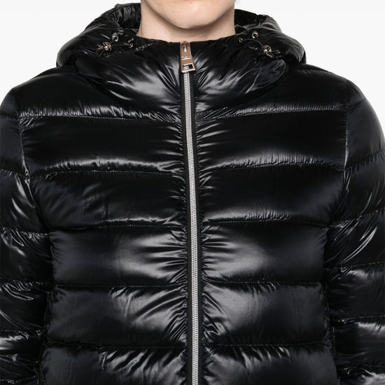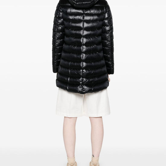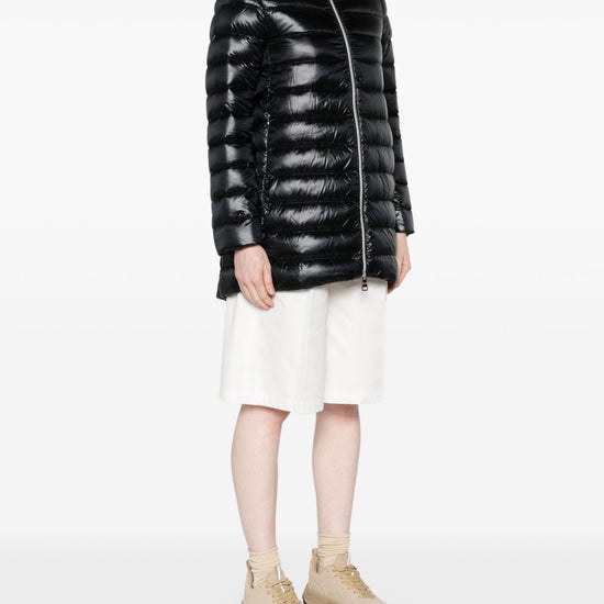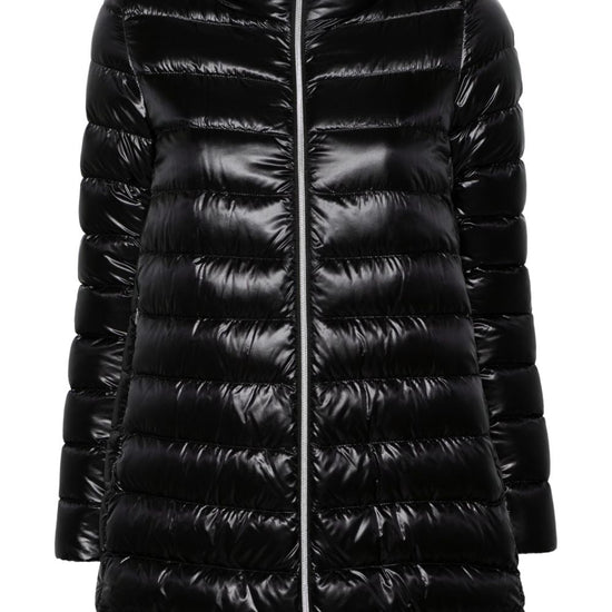 Black feather down padded design drawstring hood front two-way zip fastening long sleeves two side zip-fastening pockets rear curved hem full lining a-shape midi down jacket