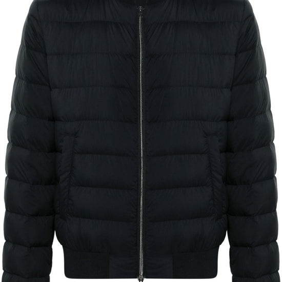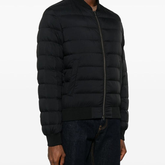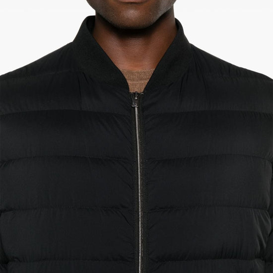 Black goose down padded design quilted ribbed band collar long sleeves two front welt pockets ribbed cuffs and hem internal slip pocket full lining front two-way zip fastening l'aviatore short down jacket