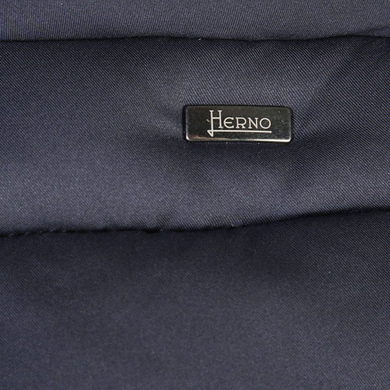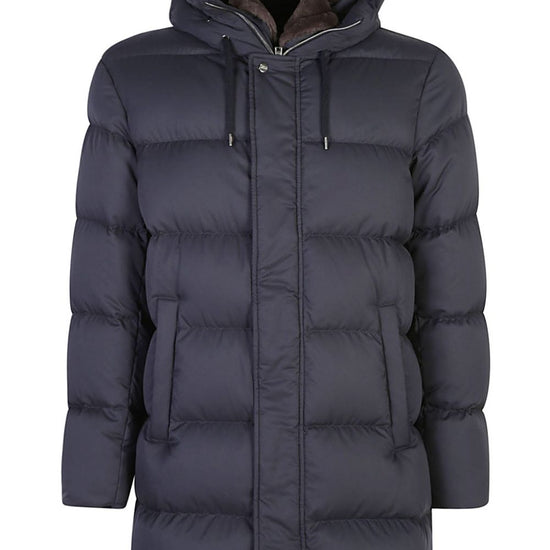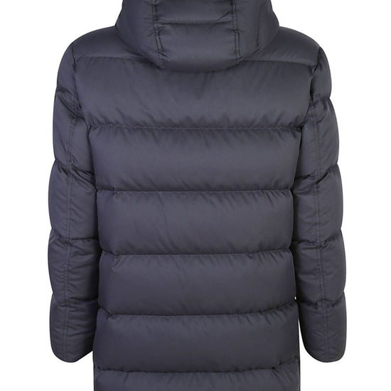 Navy blue down-feather filling padded design logo plaque drawstring hood concealed front fastening long sleeves two front welt pockets arendelle down jacket