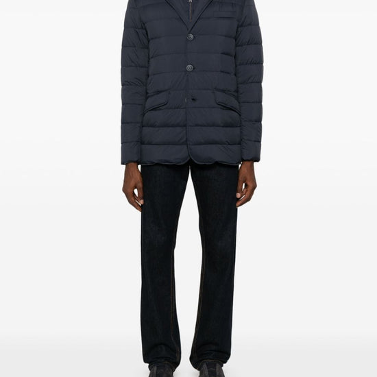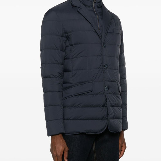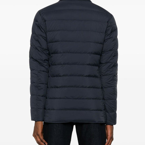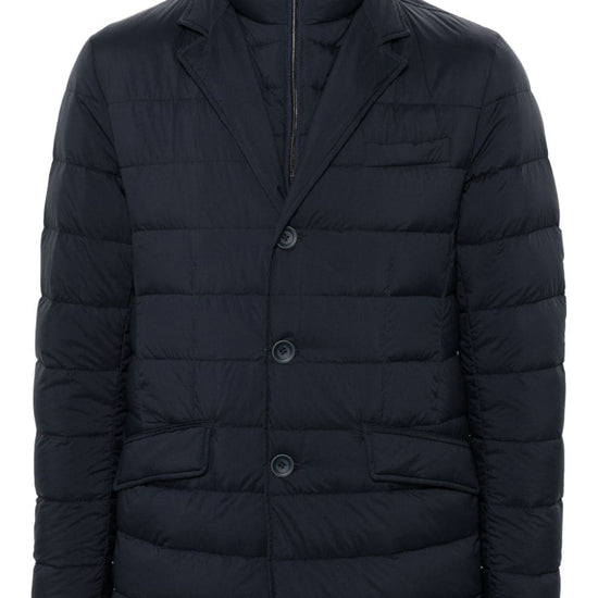 Navy blue goose down padded design insulated design layered details detachable panels notched collar long sleeves chest welt pocket two front flap pockets straight hem internal slip pocket full lining front button and zip fastening la giacca nylon down jacket