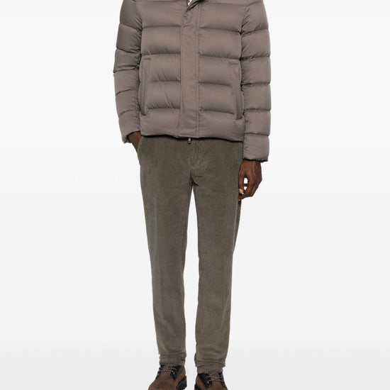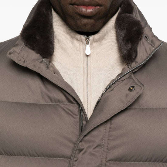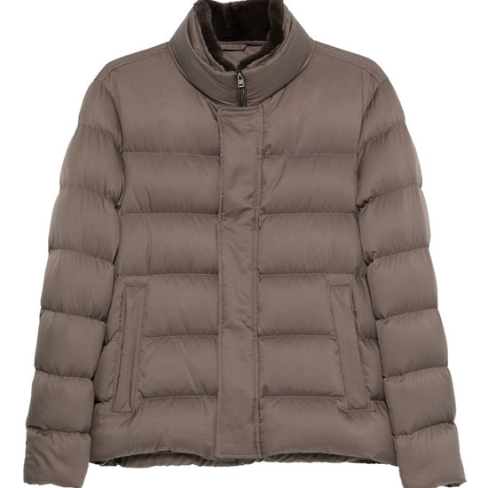 Brown quilted high neck zip fastening welt pockets stand collar arendelle down jacket