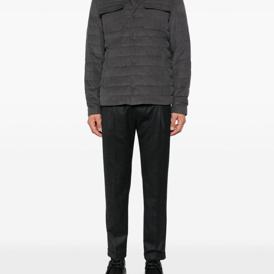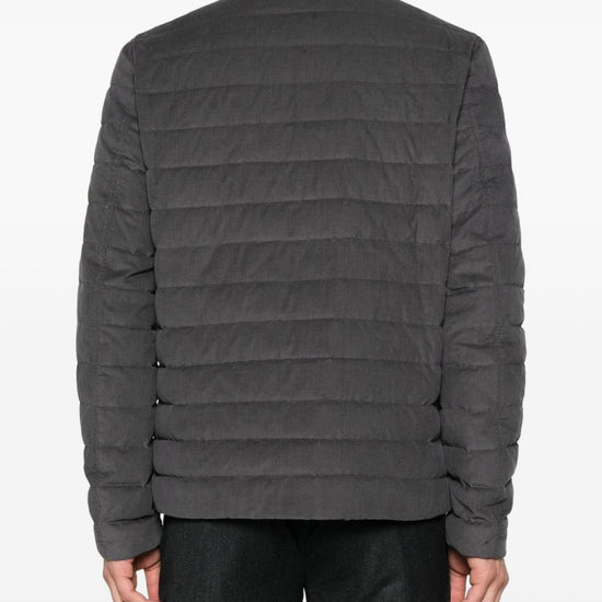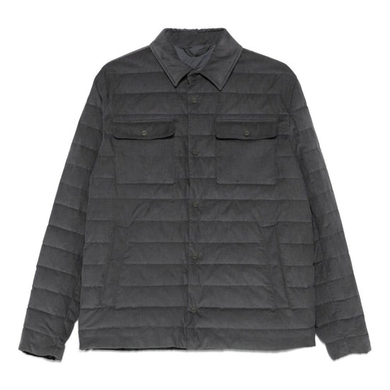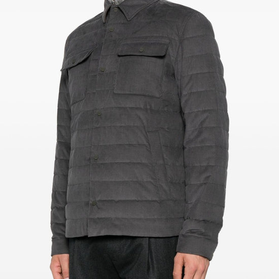 Grey quilted design button fastening flap chest pockets welt pockets long sleeves quilted down jacket