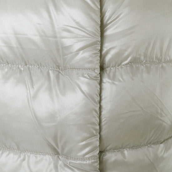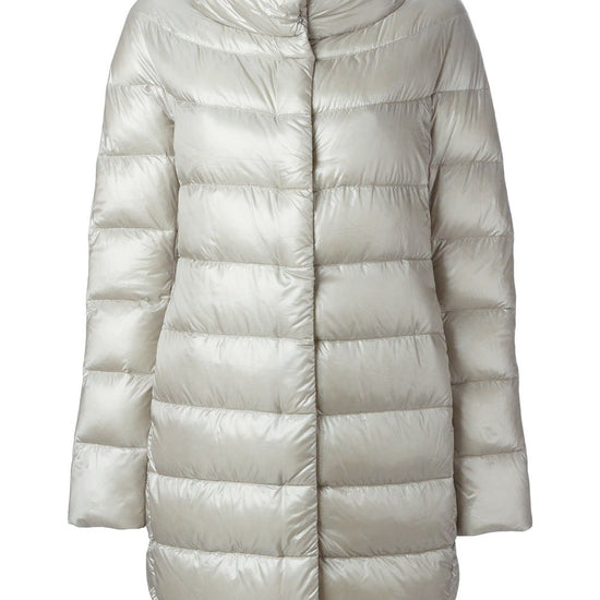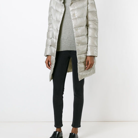 Grey cotton blend down-feather filling high neck concealed front fastening long sleeves two side inset pockets mid-length dora long down jacket