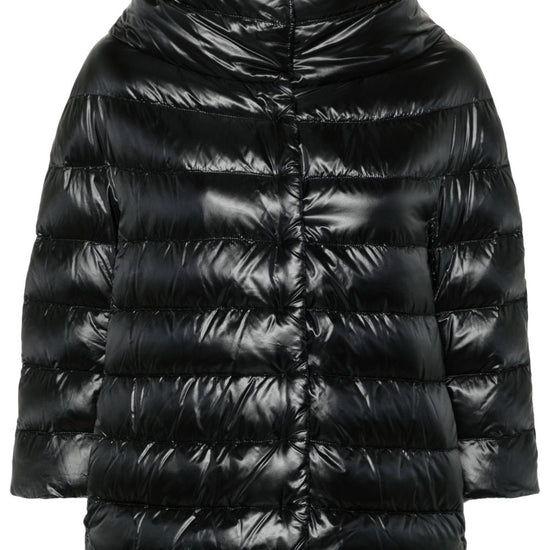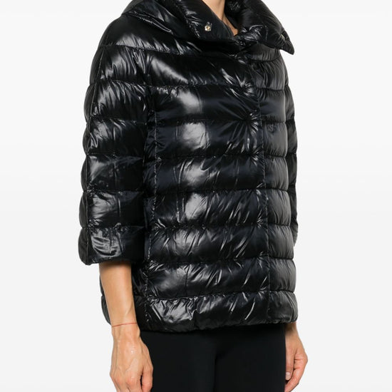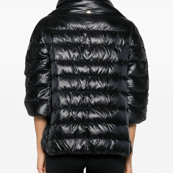 Black down-feather filling padded design quilted stand-up collar three-quarter length sleeves two side inset pockets straight hem front press-stud fastening aminta nylon cape