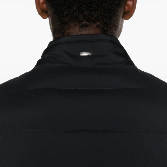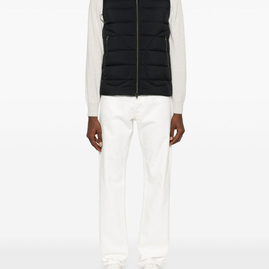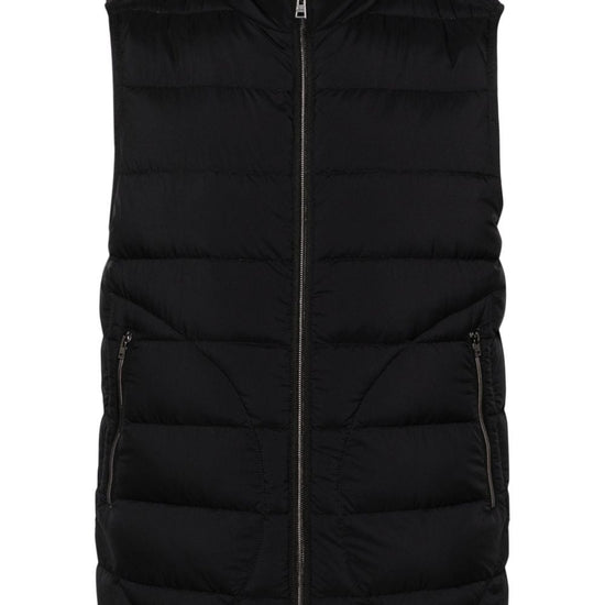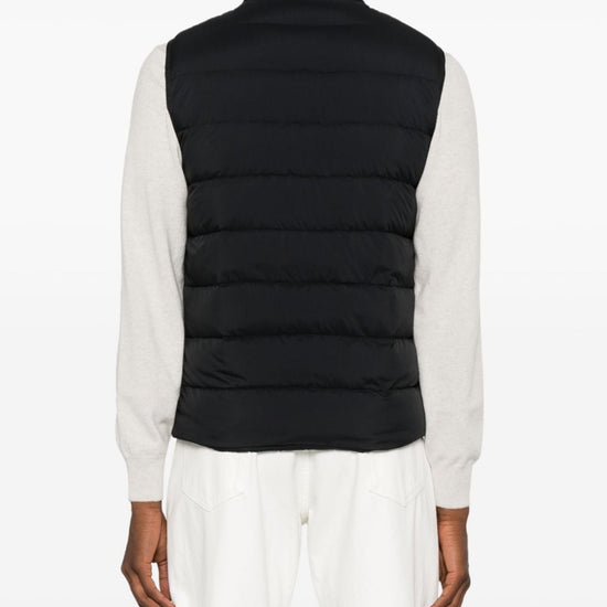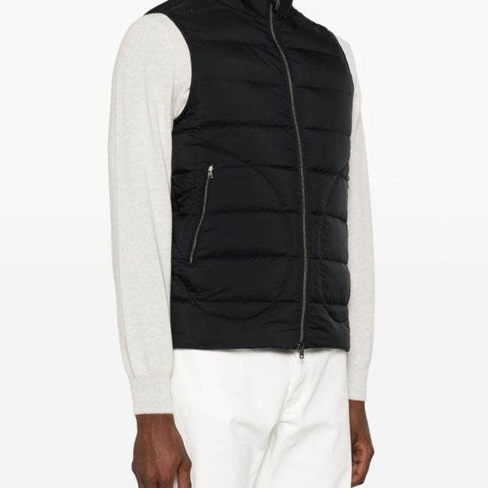 Black down-feather filling quilted lightweight construction mock neck front two-way zip fastening sleeveless two side zip-fastening pockets internal zip-fastening pockets drawstring hem full lining nylon down vest