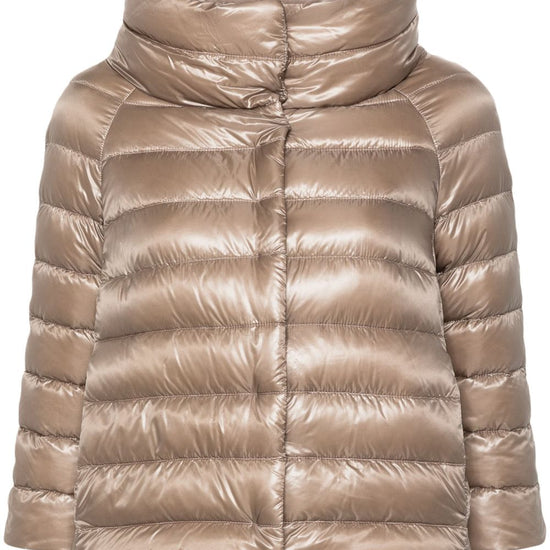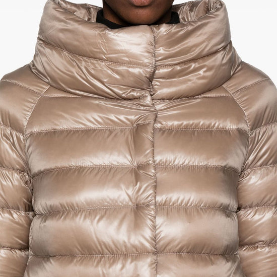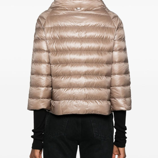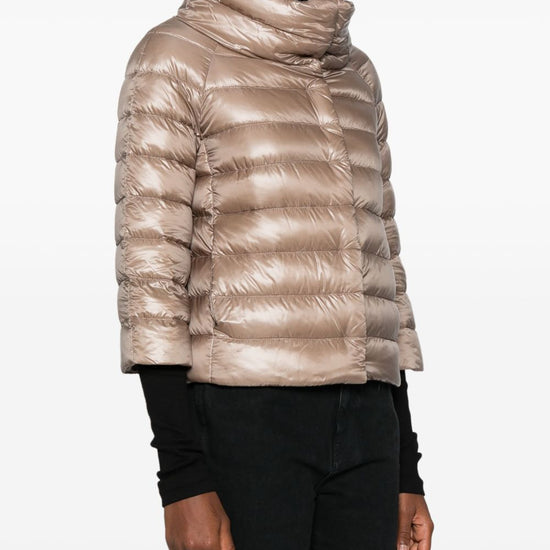 Light brown padded design goose down-feather filling lightweight construction funnel neck three-quarter length raglan sleeves two side inset pockets logo plaque at the back authenticity qr code straight hem concealed front press-stud fastening sofia nylon cape