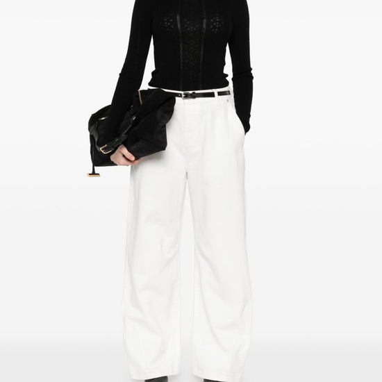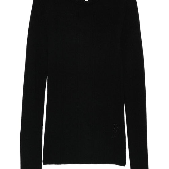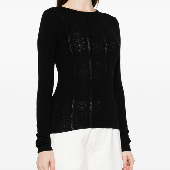 Black knitted crew neck long sleeves perforated detailing wool crewneck sweater