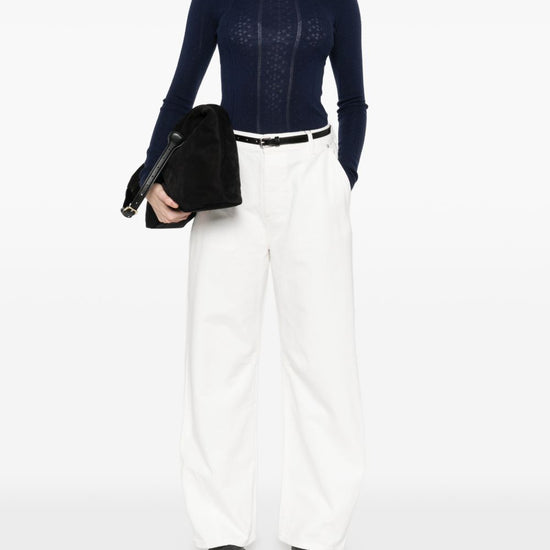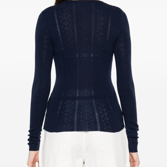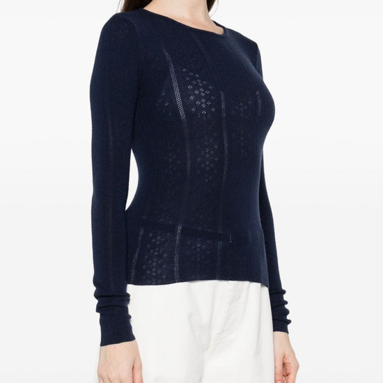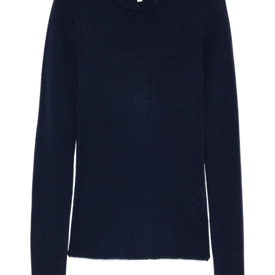 Dark navy blue long sleeves knitted construction ribbed crew-neck merino wool wool crewneck sweater