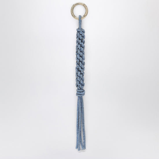 Hibourama charm with hand-woven pendant covered in blue crystals and metal ring clasp.