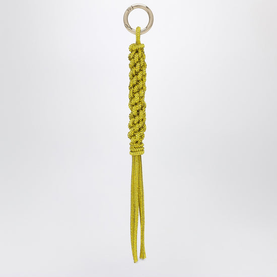 Hibourama charm with hand-woven pendant covered in yellow crystals and metal ring clasp.