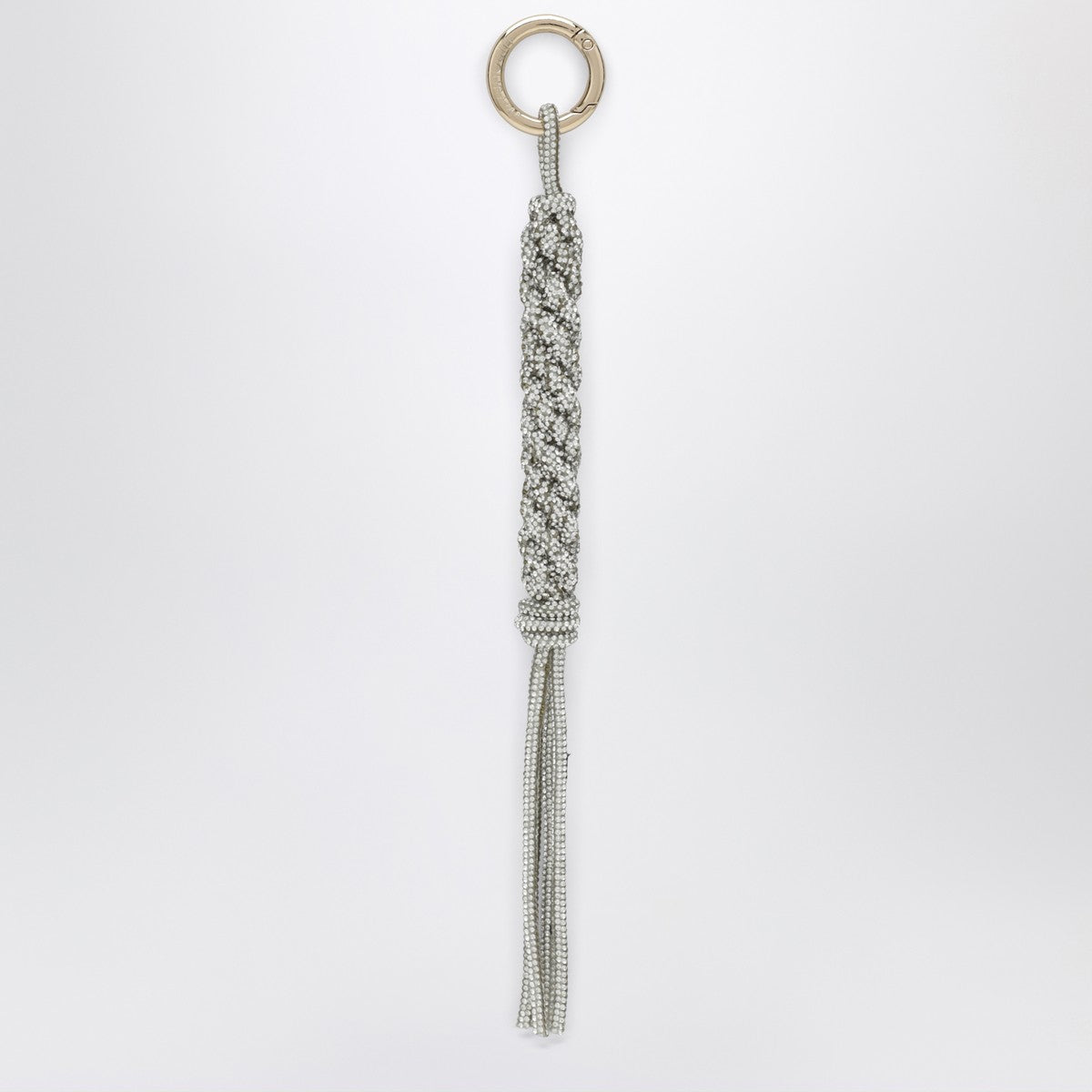 Hibourama charm with teddy bear and a combination of hand-woven silver crystal-covered pendants and metal ring clasp.