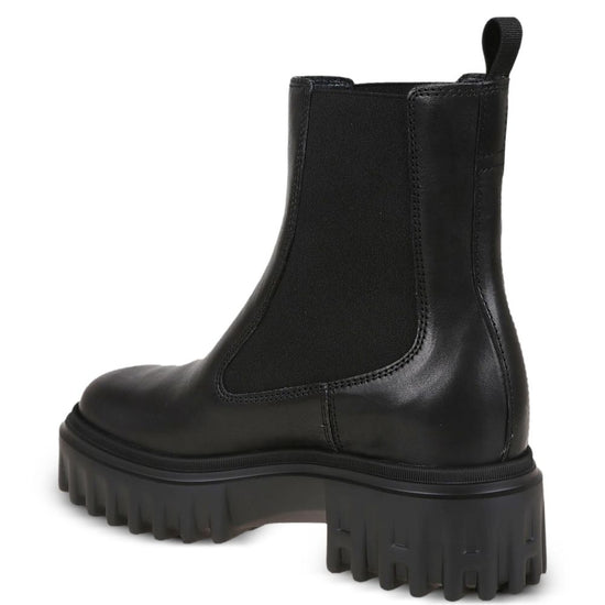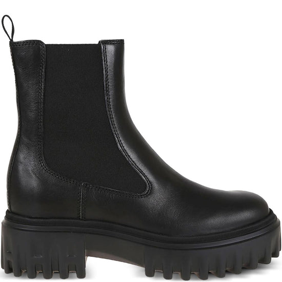 Black leather platform sole elastic side panels round toe pull tab h700 leather chelsea boots
