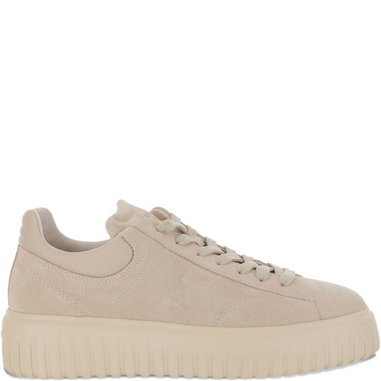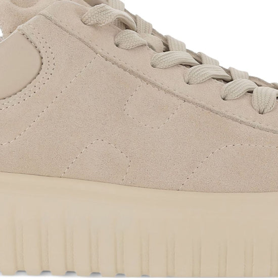 Beige suede upper vertical stripes round toe lace-up front h-stripes leather sneakers