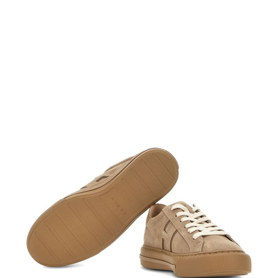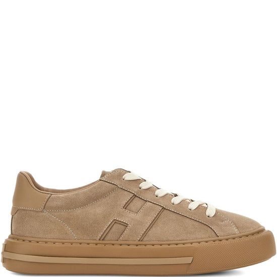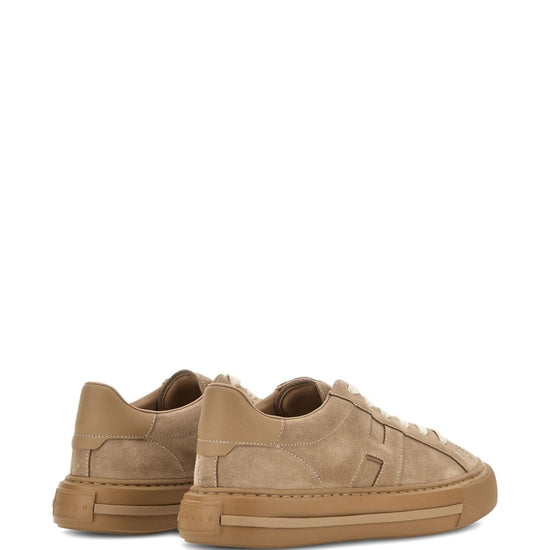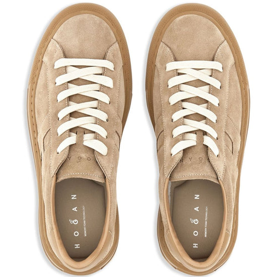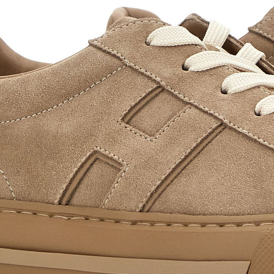Beige front lace-up fastening logo-embellished side panels round toe branded insole h691 leather sneakers