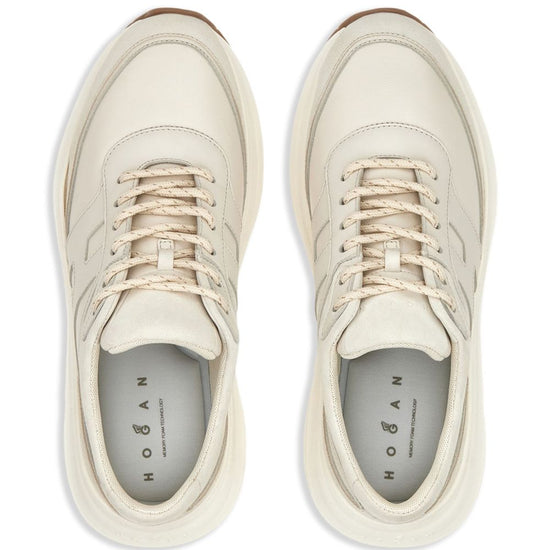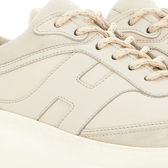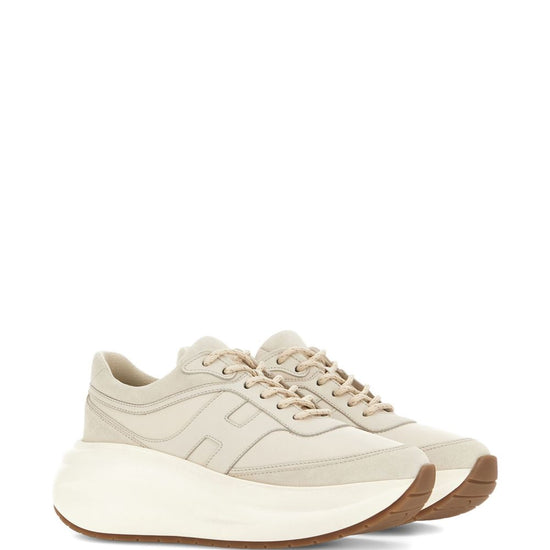 Beige front lace-up fastening logo-embellished side panels round toe platform sole h696 leather sneakers