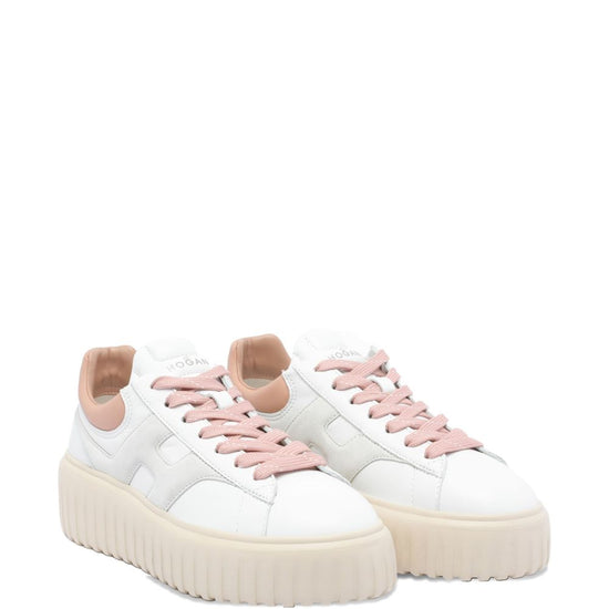 White leather upper h logo lace-up closure round toe platform sole h-stripes leather sneakers