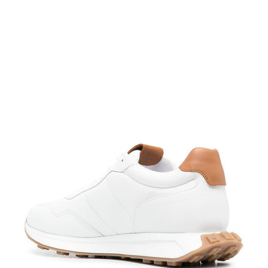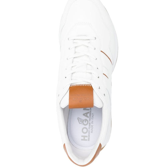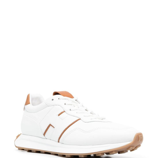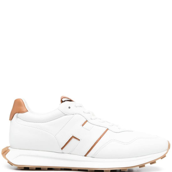 Contrast-detailing sneakers from hogan featuring white, barley brown, calf leather, contrasting panel detail, logo-embossed tongue, logo patch to the side, round toe, front lace-up fastening, contrasting heel counter and flat rubber sole. h601 h601 leather sneakers size and fit - heel 1,2 in / 3 cm, platform 0,8 in / 2 cm