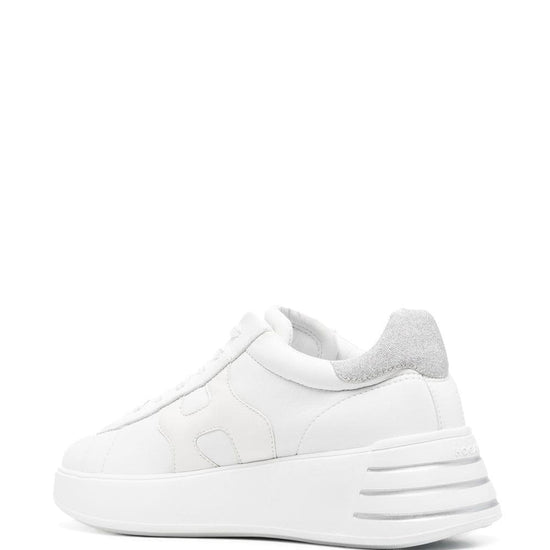 White leather logo patch to the side metallic threading round toe front lace-up fastening branded insole platform sole rebel leather sneakers