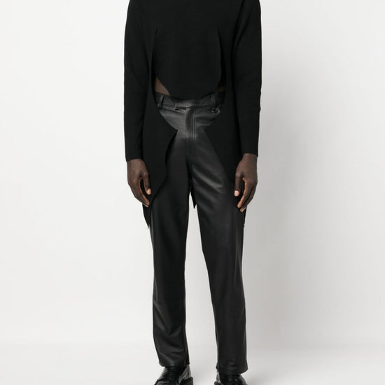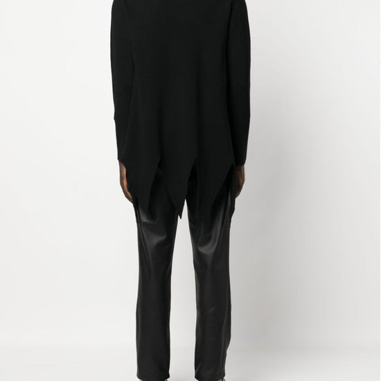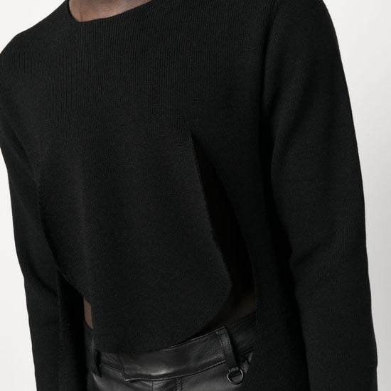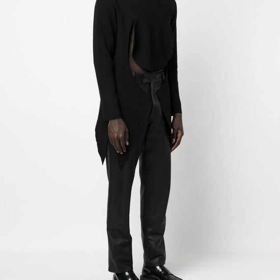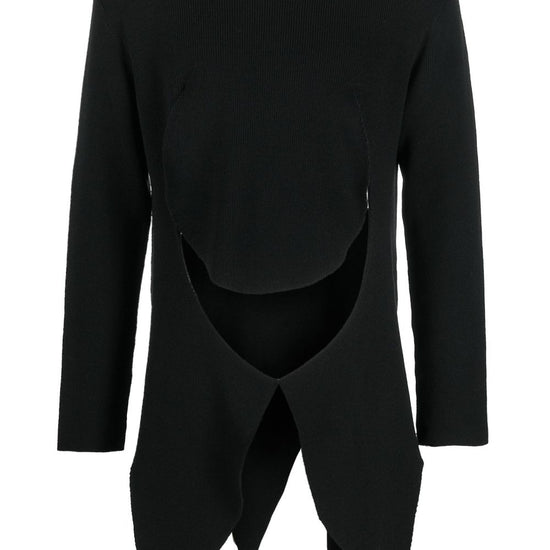 Cut-out detail asymmetric jumper from comme des garçons homme plus featuring black, ribbed knit, cut-out detailing, asymmetric design, round neck and long sleeves. wool asymmetric jumper size and fit - this piece fits true to size. we recommend you get your regular size. model is 1,84m / 6ft 1in wearing size m