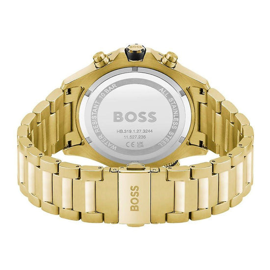 the hugo boss 1513932 chronograph gold-tone stainless steel watch is a bold and sophisticated timepiece designed for the modern man. this luxurious watch features a robust gold-tone stainless steel case and bracelet, exuding confidence and style. the striking black dial is complemented by gold-tone hands and markers, with three chronograph sub-dials offering precise timekeeping and additional functionality. a date display is positioned at the 9 o'clock mark, enhancing the watch's practicality. with water resistance up to 10 atm, this watch is as durable as it is stylish, making it perfect for both formal occasions and everyday wear.