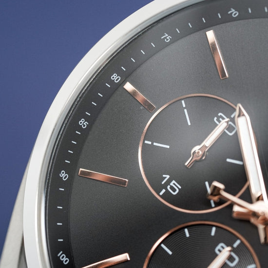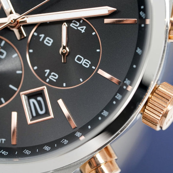 japanese made quartz chronograph movement. 24 hour counter. running seconds. 30 minute counter. date.