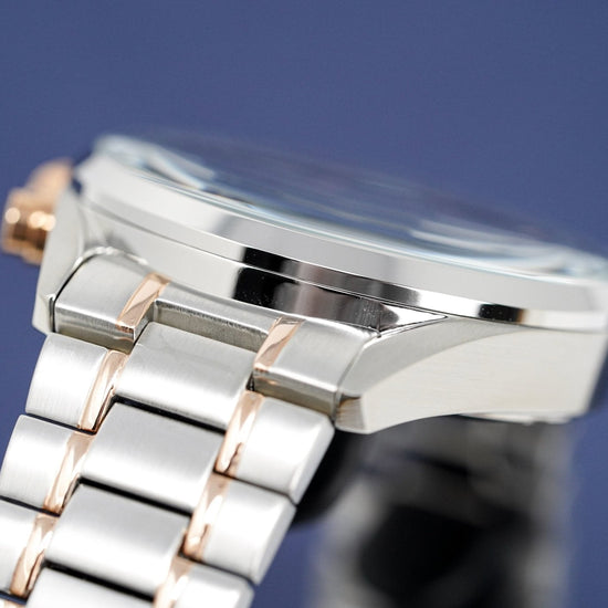 stainless steel matte and rose gold plate polished bracelet with stainless steel push button deployment clasp.