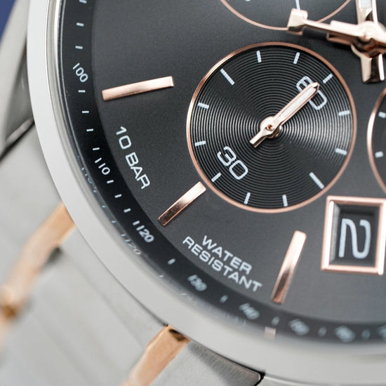 black sunburst dial. luminous steel rose gold plate hands. stainless steel rose gold plate indexes. date window at 4:30.
