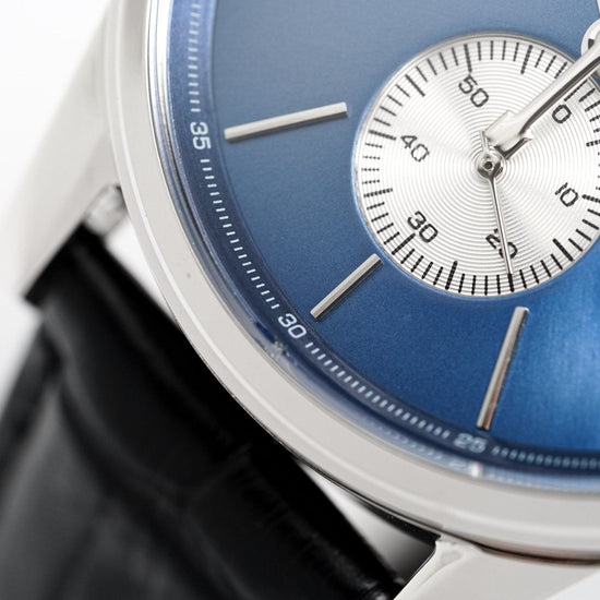 japanese made quartz chronograph movement. running seconds. 30 minute counter. 24 hour indicator. date.