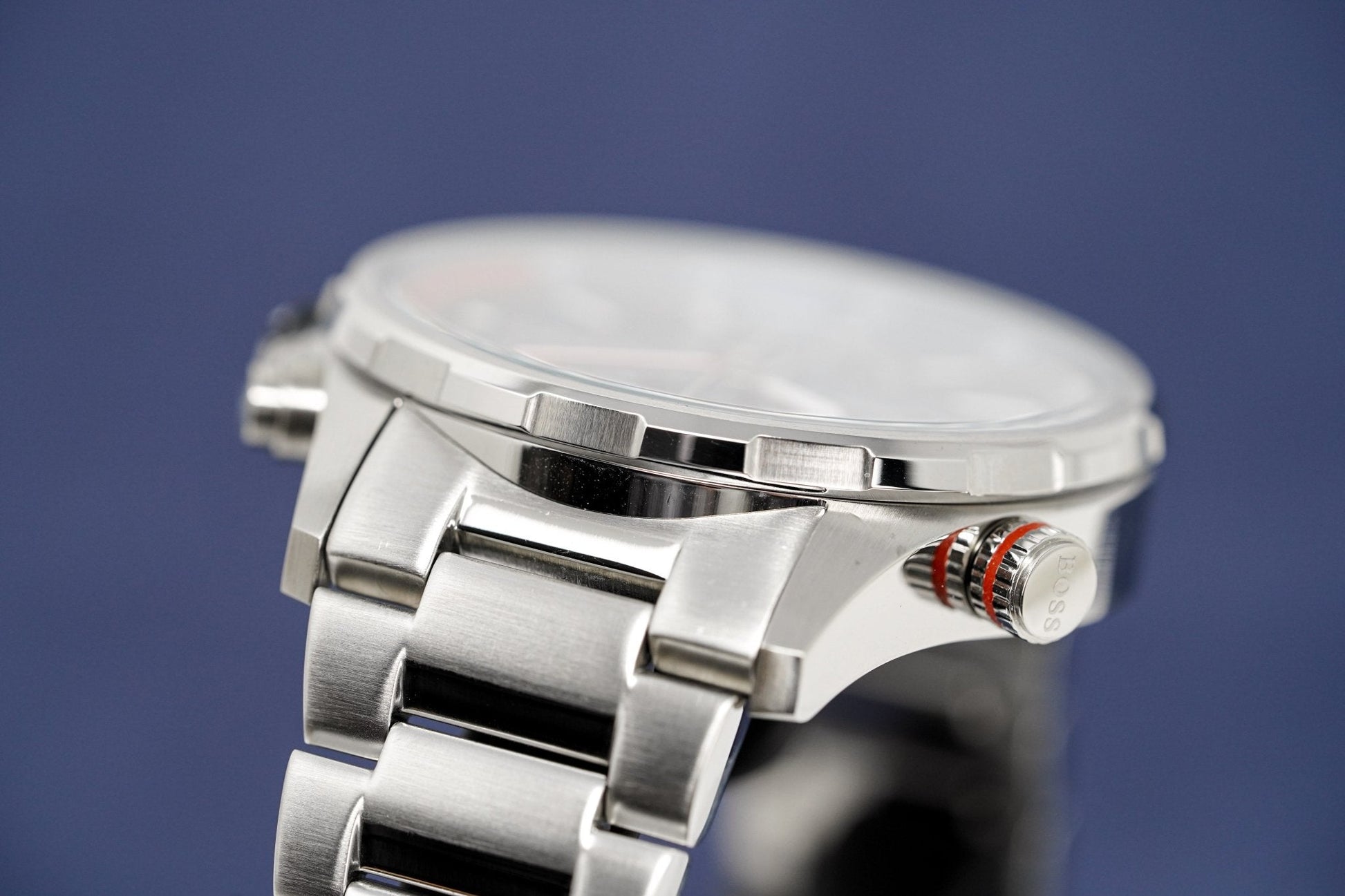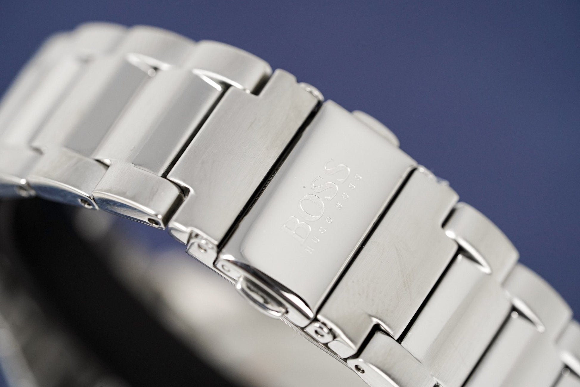 stainless steel polished bracelet with stainless steel push button deployment clasp.