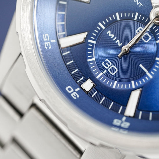 blue sunburst dial. luminous steel hands. stainless steel hands. date window at 9.
