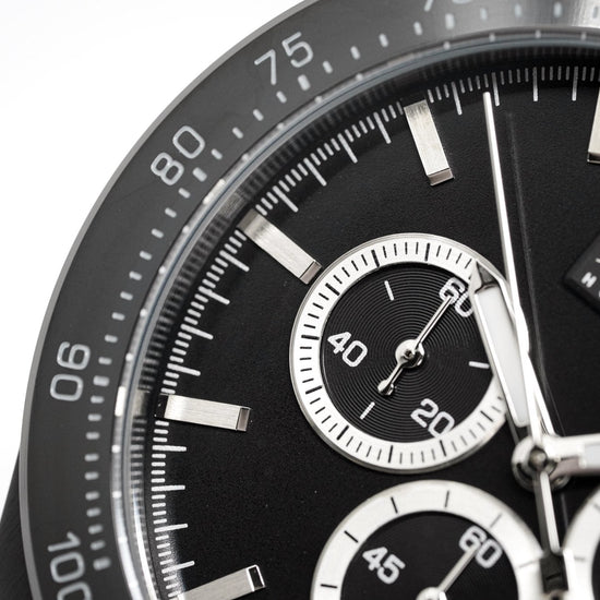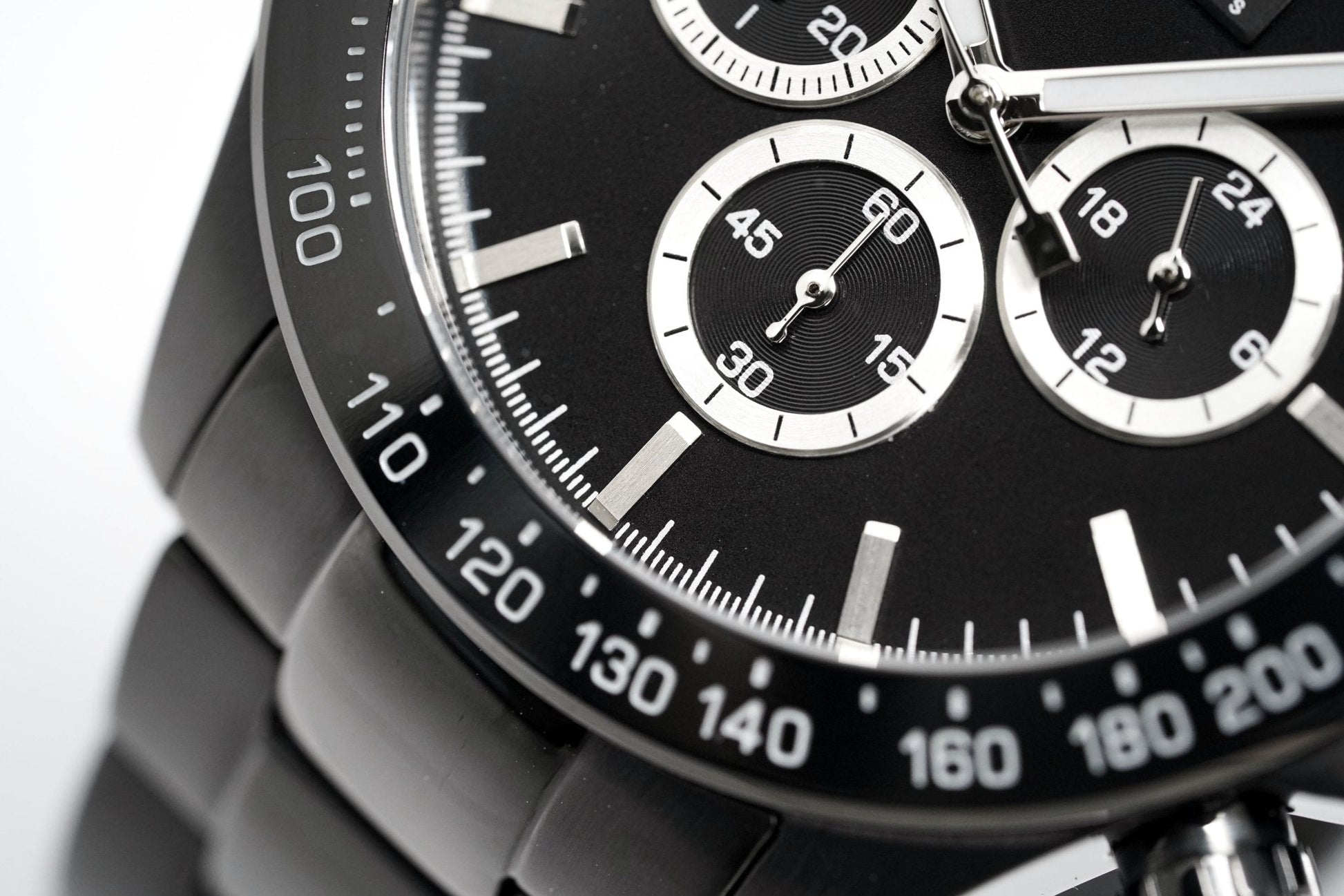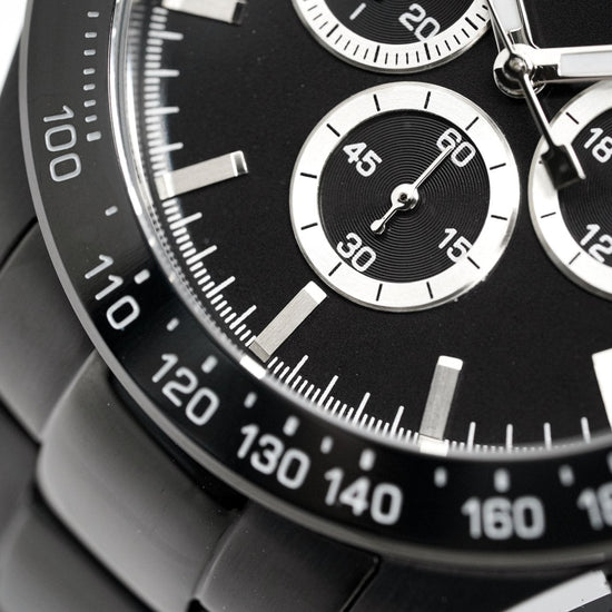 44mm black pvd plated stainless steel case. scratch resistant mineral crystal. tachymeter bezel.