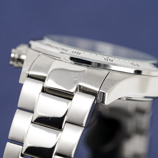44mm stainless steel case. scratch resistant mineral crystal. tachymeter bezel.