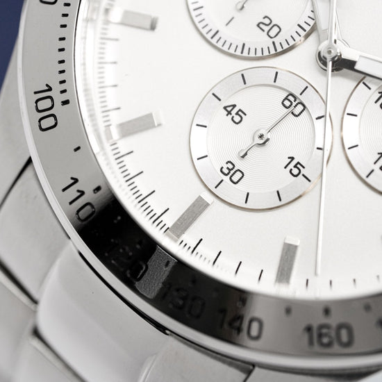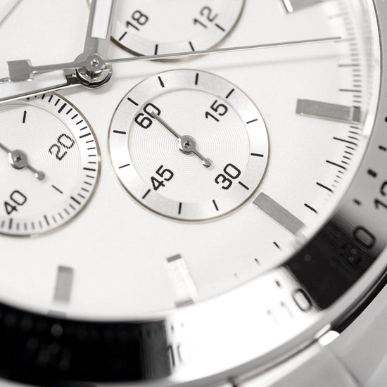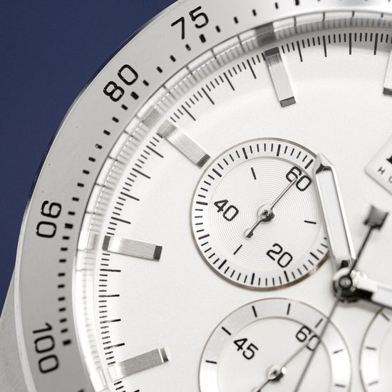 japanese made quartz chronograph movement. running seconds. 60 minute counter. 24 hour indicator.