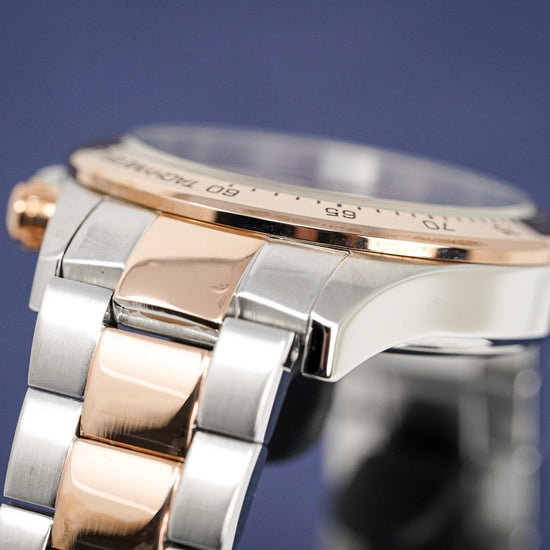 two tone rose gold pvd plated/stainless steel bracelet with push button deployment clasp.