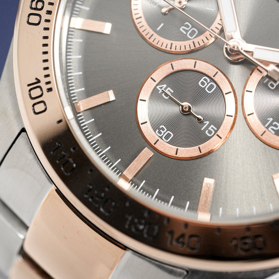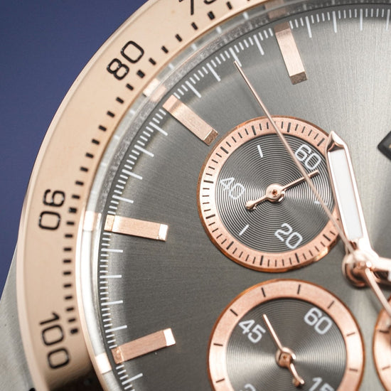 grey sunburst dial. luminous rose gold pvd plated steel hands. rose gold pvd plated stainless steel stick indexes.