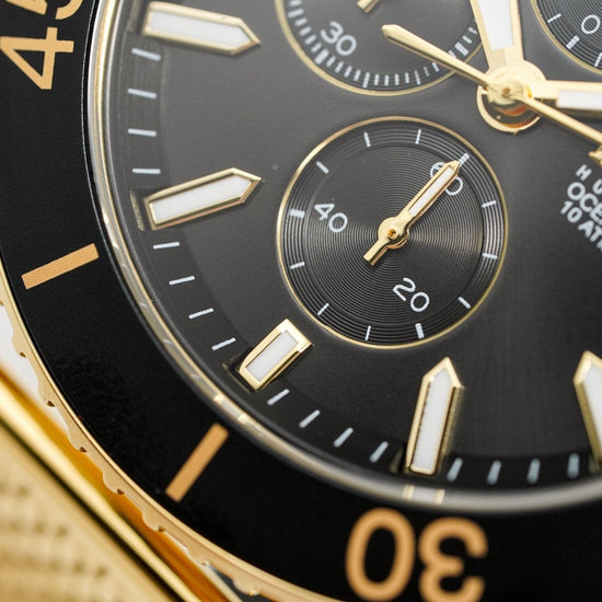black dial. luminous gold pvd plated steel hands. luminous gold pvd plated stainless steel stick indexes